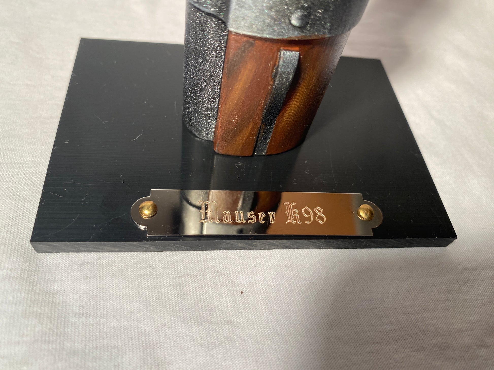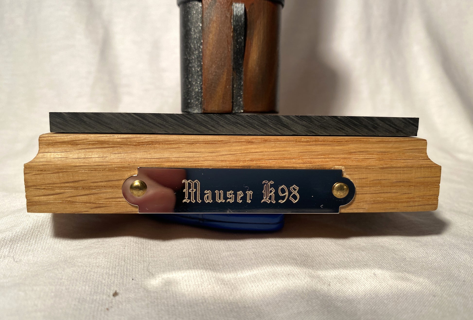Option 8 : Socle bois teinté chêne clair avec plaque métal gravée et cartouche calibre 8 x 57 IS authentique neutralisée